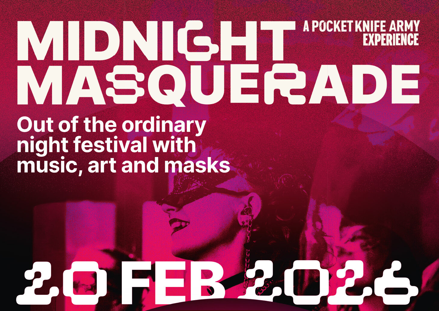 Midnight Masquerade is een uniek nachtfestival waar je wordt verrast met een onverwachte mix van kunstvormen. Muziek, dans, audiovisuele kunst, performance art, theater, mode, DJ’s en meer. Een combinatie van een Bal Masqué, een kunst- en muziekfestival en een clubnacht, waar je mag zijn wie je wilt zijn. Draag je masker met trots en doe mee met Midnight Masquerade als je op zoek bent naar avontuur.